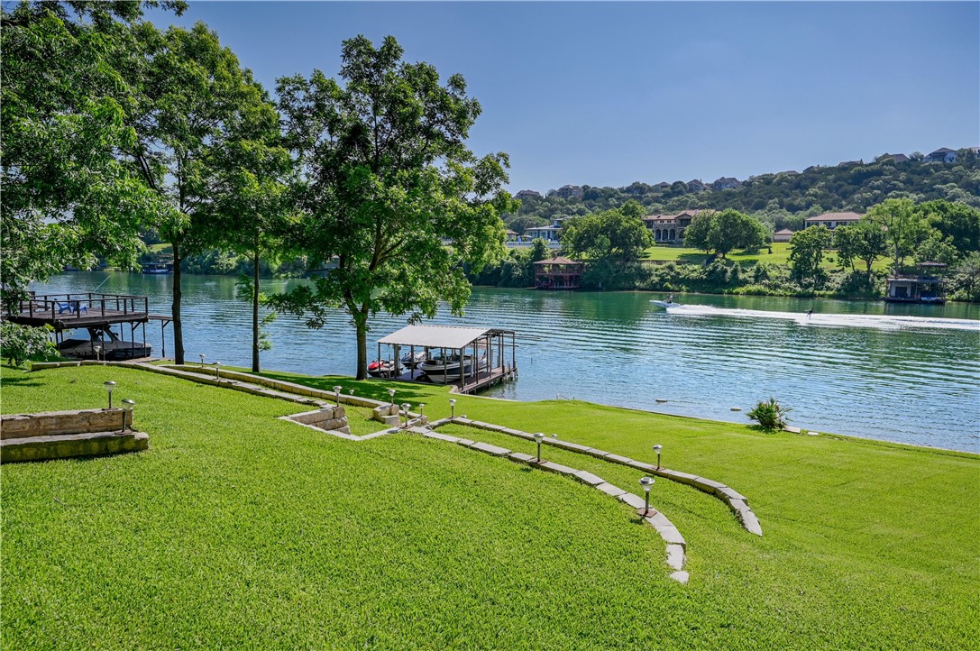 LAKE AUSTIN LIVING AT ITS FINEST. Glorious lot with 75+/- feet of Lake Austin waterfront. Gently terraced lawn leads right to the water, a perfect setting for barbeques or formal parties. Lush foliage flows over the upper level of the backyard and surrounds a stone patio perfect for dinners al-fresco. The house is situated at the top of the lot, providing an incredible view of the water and gentle hills across the lake. A huge patio across the back of the house allows you to enjoy the vista with easy access to the kitchen for fixing drinks or a snack. DESIGNED TO HOST FAMILY AND FRIENDS. The interior is simple yet elegant, with neutral travertine marble flooring and warm hickory cabinetry designed to set off the natural beauty seen through the two-story windows. The main-floor primary bedroom features an en-suite bathroom and walk-in closet. On the second level, enjoy wide-plank wood floors, three additional bedrooms upstairs plus a large game room with plenty of room for family and guests. *Taxes are estimates based on the 2021 rate and assessed value. All tax figures should be independently verified.* 24-Hour Advance Showing Notice.